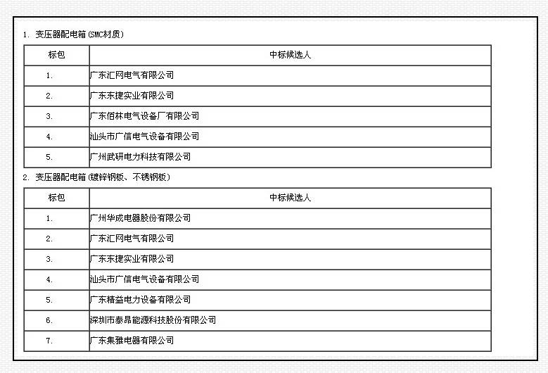 我公司參加廣東電網公司2013年配網設備材料(變壓器配電箱)框架招標項目,就變壓器配電箱投標項目獲得了評標專家組的一致認可。中標公示網站:http://www.gy-center.net/announce/news-7244.jsp